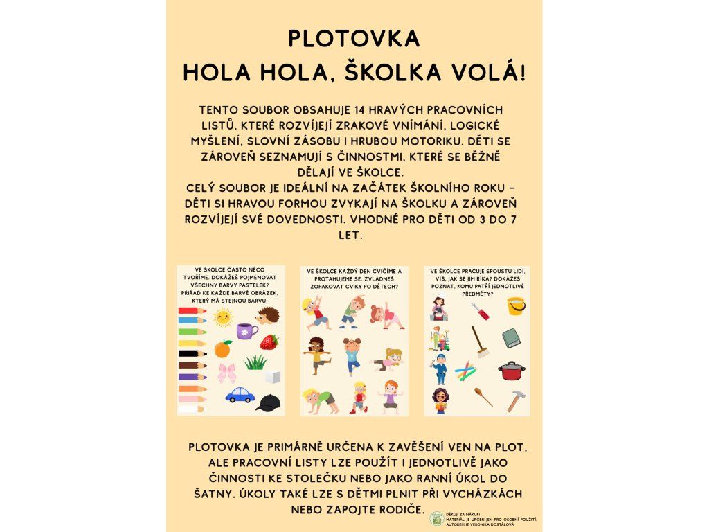 Tato plotovka obsahuje 14 zábavných pracovních listů, které rozvíjejí důležité dovednosti dětí přirozenou a hravou formou. Děti se zároveň seznamují s běžným chodem mateřské školy – poznávají prostředí, činnosti i situace, se kterými se ve školce setkají.