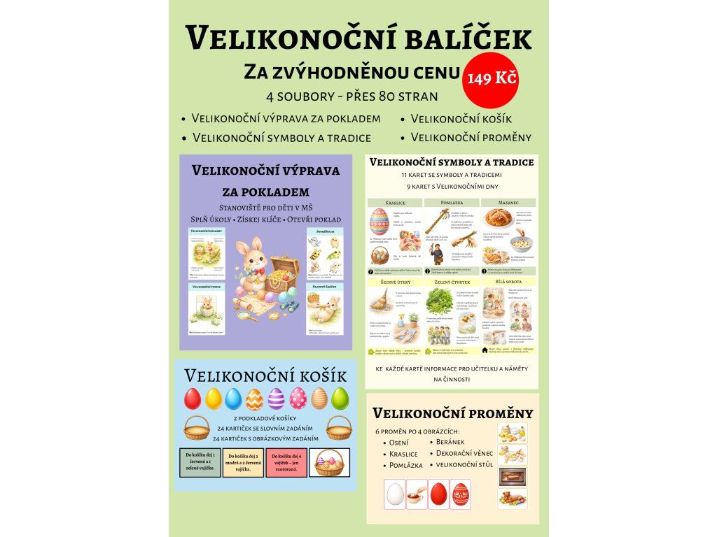Tento velikonoční balíček obsahuje vše, co potřebujete pro hravé učení, tvoření i tematické aktivity v mateřské škole. V jednom balíčku získáte 4 oblíbené soubory za zvýhodněnou cenu.