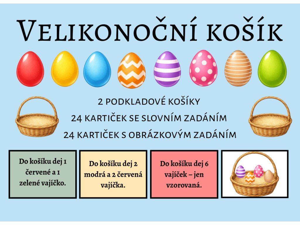 Velikonoční košík je logicko-manipulační aktivita, ve které děti skládají vajíčka do košíku podle slovního nebo obrázkového zadání.